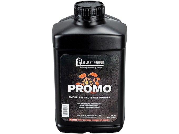 Offered by Alliant, Promo has the same burn speed as Red Dot, but is more dense, thus requiring a smaller bushing to obtain the same charge weight. It meters easily and charges consistently. Ideal for use in 12 gauge loads, but can also be used in some handgun loads.