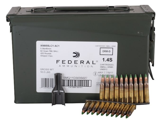 This Federal Lake City Ammunition has been loaded to true NATO specifications. This is the same ammunition that is currently being used by the US Military and meets strict quality assurance standards and specifications. Packaged in a new, sealed, Mil-Spec reusable metal ammo can closed with a tamper-evident seal. Ammunition is conveniently loaded into Mil-Spec 10-round stripper clips. A Mil-Spec steel stripper clip guide is included for quick, easy loading of any USGI Spec M16/AR-15 magazines. The SS109 bullet is a steel penetrator-tipped, lead core bullet complete with the standard green paint used to designate penetrator tip ammunition. This ammunition is non-corrosive in boxer-primed, reloadable brass cases.