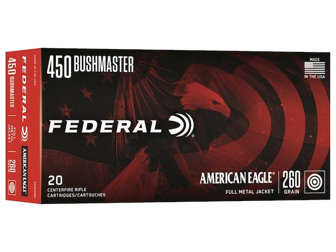 Category: 450 bushmaster ammo Tag: Federal Premium American Eagle 450 Bushmaster Ammo 260 Grain Full Metal Jacket Brand: Federal AmmoProduct ID: 53372
